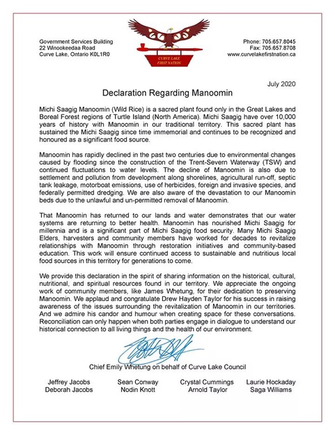 Further to our discussion this morning - the part about “Cottagers and Indians” - here is a copy of a statement from the Chief of the Curve Lake Council about Manoomin - (wild rice).