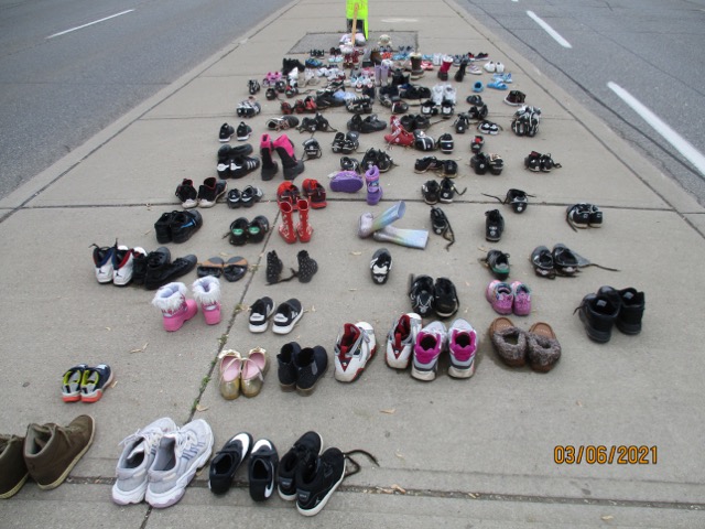 Gatherings were held around sacred fires across the country. Prayers were sung and spoken. Church bells were rung. Orange ribbons were tied on branches and fences. Shoes were laid out on the steps of churches and government buildings. Candles were lit and flags were lowered as a sign of respect.