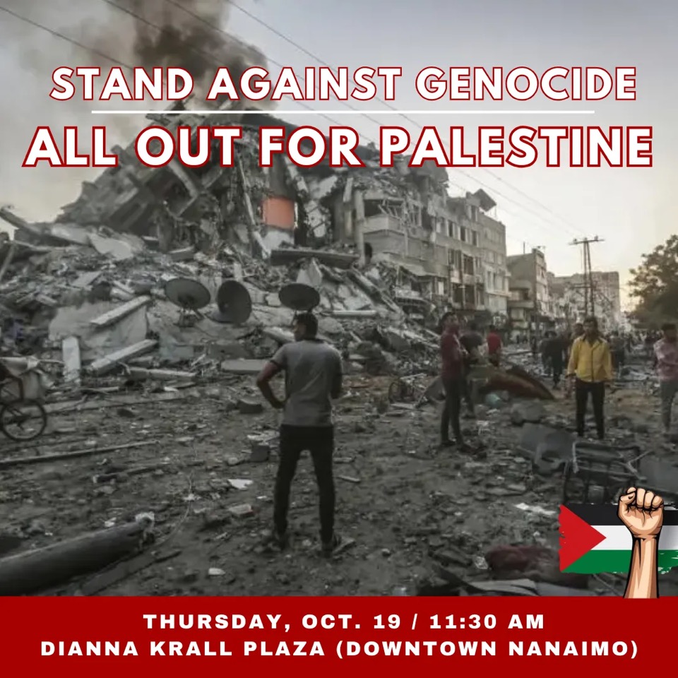 As Israel continues to commit war crimes and genocide against Palestinians, we will be having an emergency protest to call for action on Thursday, October 19th at 11:30 at the Diana Krall Plaza Downtown Nanaimo .