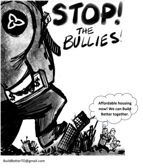 Over the past year I have been working with a group of concerned citizens to demand that the developer of a hi-rise condo project at the north-west corner of Bloor & Dundas West include a range of affordable units so that the area does not turn into another high income enclave. This site was zoned for about 100 units and the City agreed recently to permit Timbertrin, the developer, to build a 27 storey building with 327 units; and the only concession was 26 mid-range affordable units. This developer and others are making huge profits based on the large increases in units being awarded by the City and the Province. The city politicians say that if they don't agree to the requests of the developers, then the Ford government will use its powers to give them what they want. Most developers are using this situation as an excuse to not consult with neighbourhood groups, and they are not open to discussing community amenities for the neighbourhoods that are being impacted.