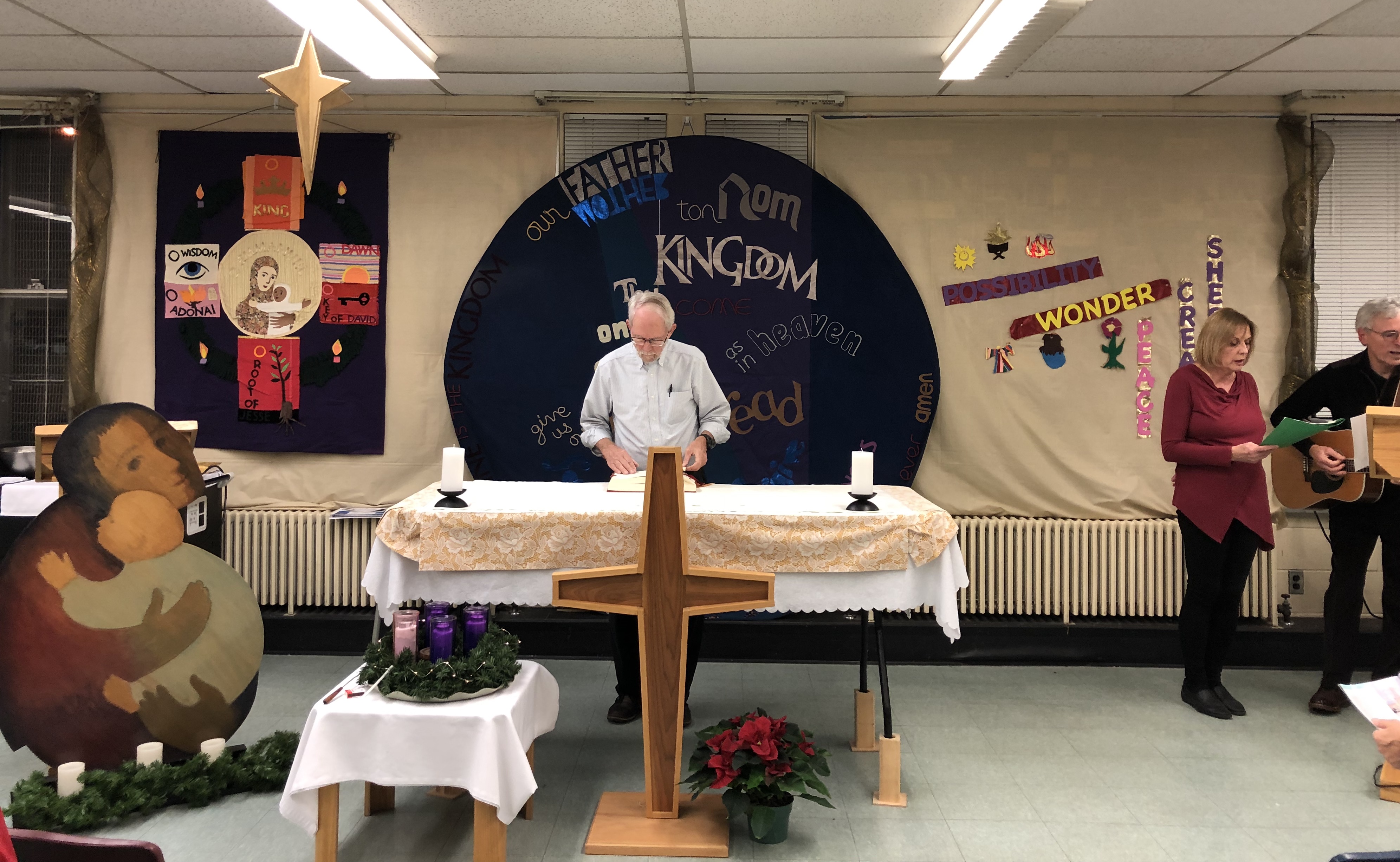 > The Our Father is behind the altar. The Christmas banner hangs beside it and the wooden painting of Mary sits on a stand to the left of the altar. Fr Bob Holmes was our celebrant.